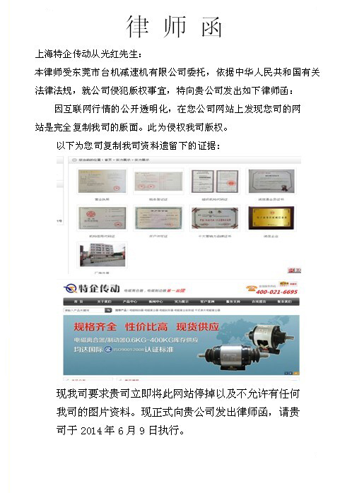 上海特企傳動復(fù)制我司網(wǎng)站的版面,侵犯我司版權(quán)。依據(jù)中華人民共和國有關(guān)法律法規(guī),2014年6月9號我司向上海特企傳動發(fā)出律師函,要求上海特企立即停止網(wǎng)站的運行以及去掉我司的圖片資料。